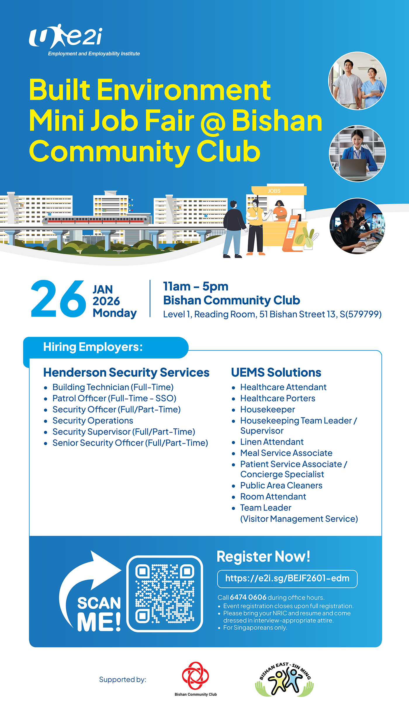 | Title : | Built Environment Job Fair @ e2i Jobs and Skills Centre (Bishan Community Club) on 26 Jan |