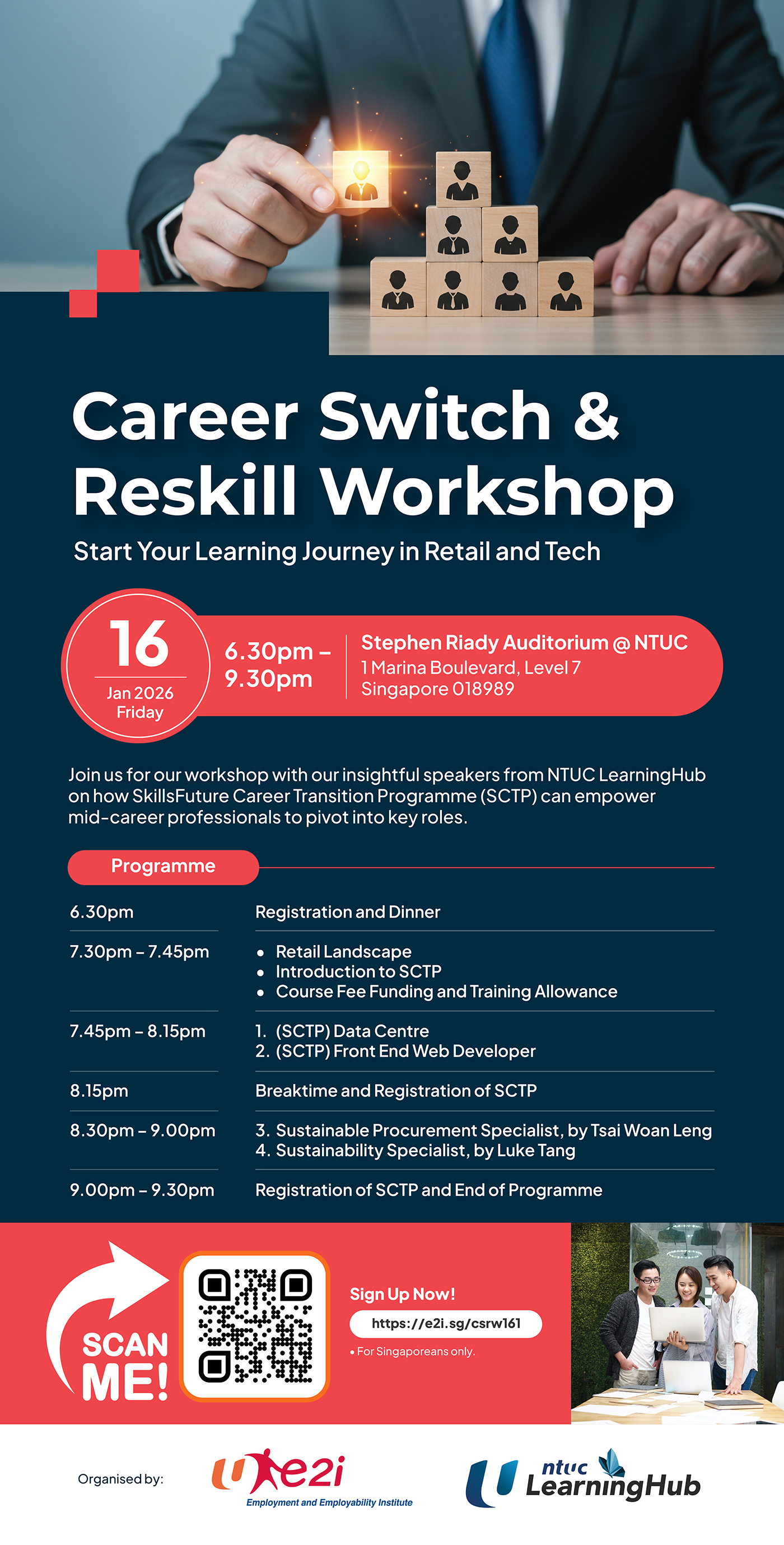 Join us for our workshop with our insightful speakers from NTUC LearningHub on how SkillsFuture Career Transition Programme (SCTP) can empower mid-career professionals to pivot into key roles.