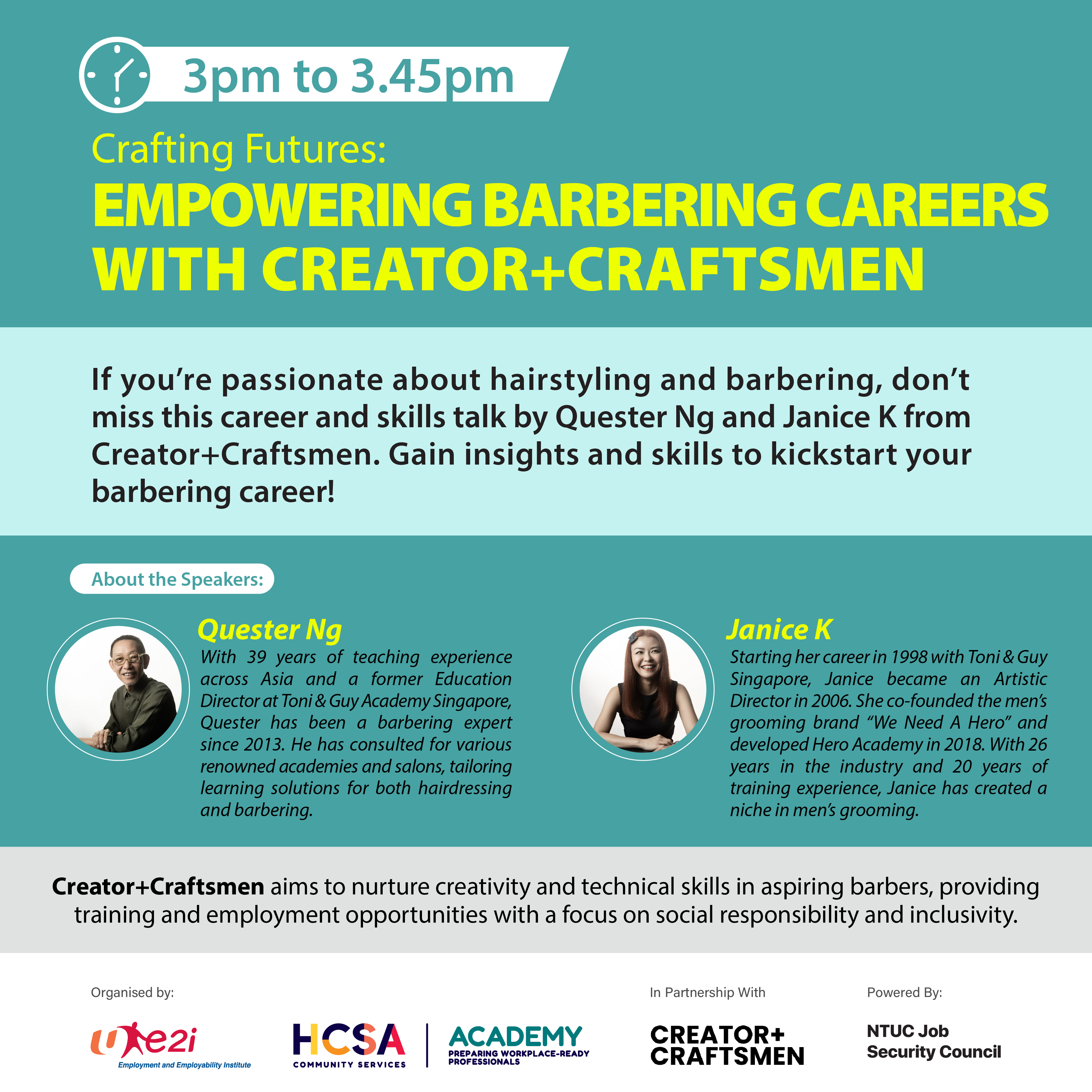 If you’re passionate about hairstyling and barbering, don’t miss this career and skills talk by Quester Ng and Janice K from Creator+Craftsmen. Gain insights and skills to kickstart your barbering career!