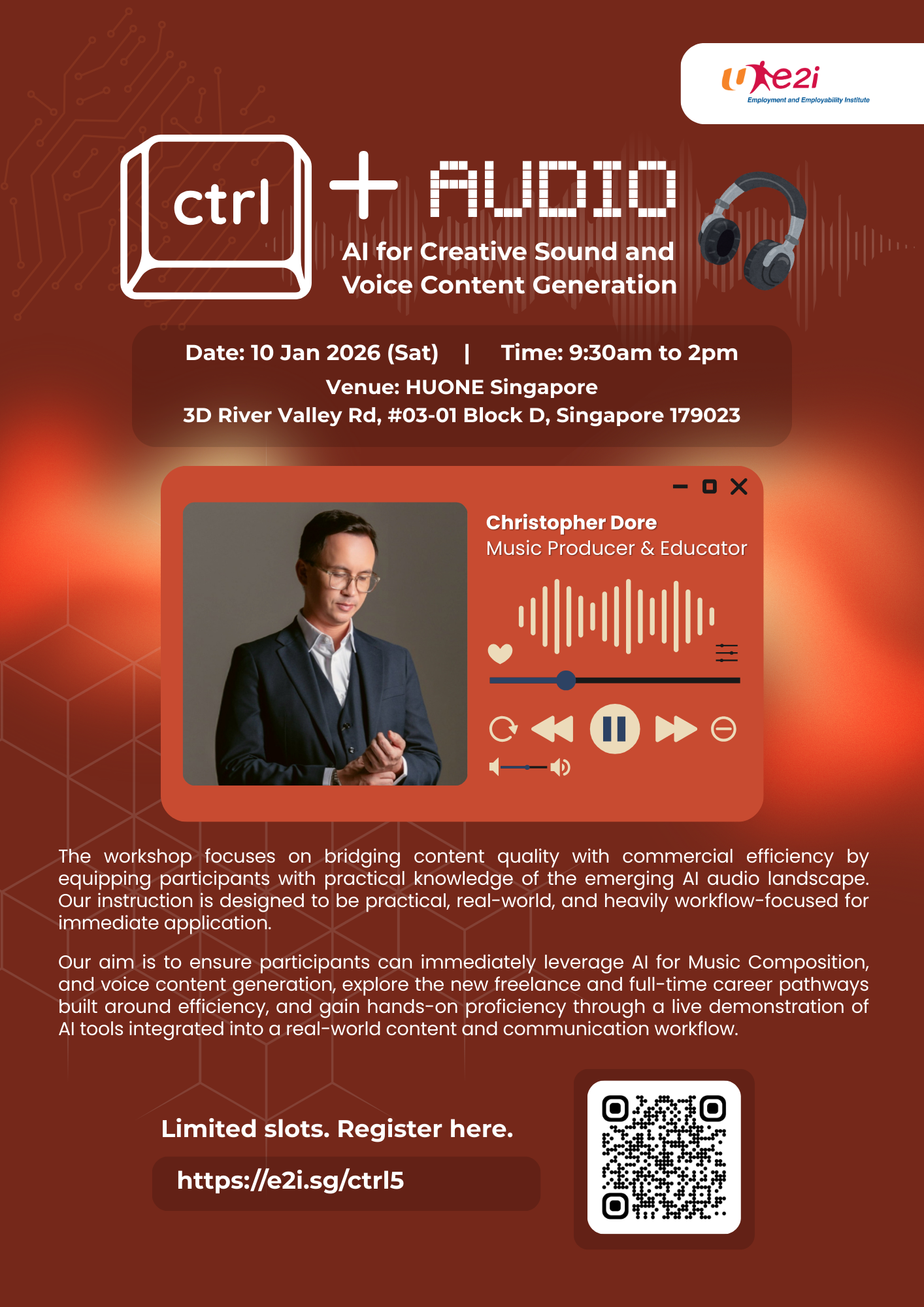 Our aim is to ensure participants can immediately leverage AI for Music Composition, and voice content generation, explore the new freelance and full-time career pathways built around efficiency, and gain hands-on proficiency through a live demonstration of AI tools integrated into a real-world content and communication workflow.