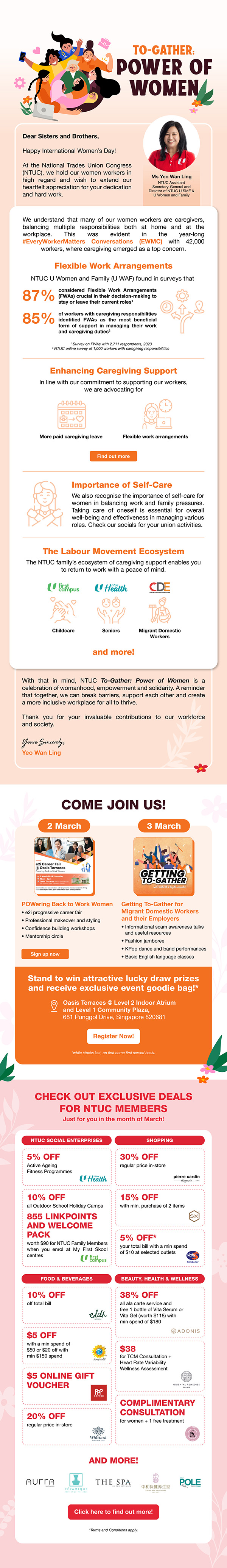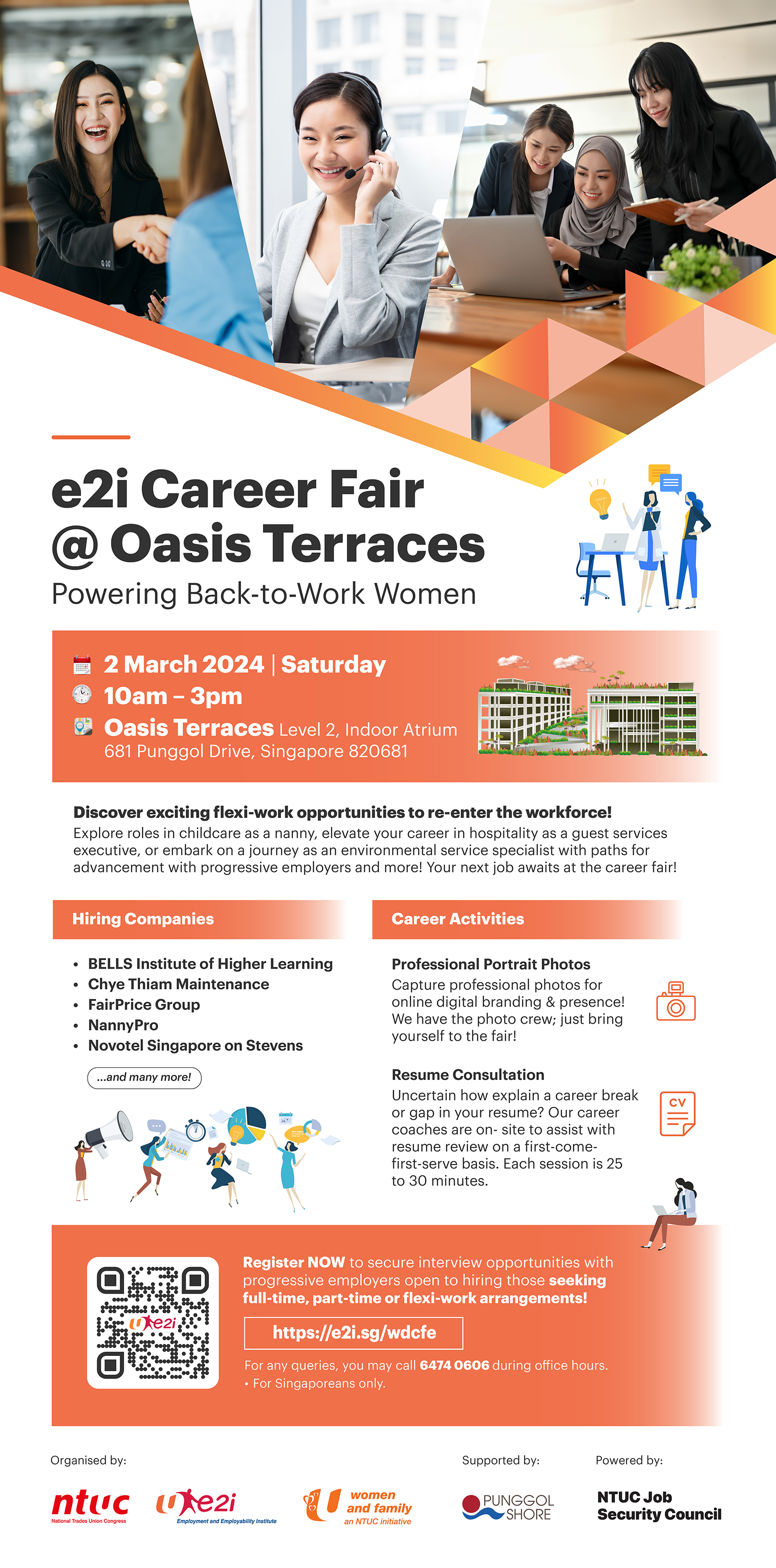e2i is organizing a 1-day career fair in conjunction with the International Women Day Carnival (Click for more info on the carnival) by NTUC's Women & Family team at Oasis Terraces on 02 March 2024.
