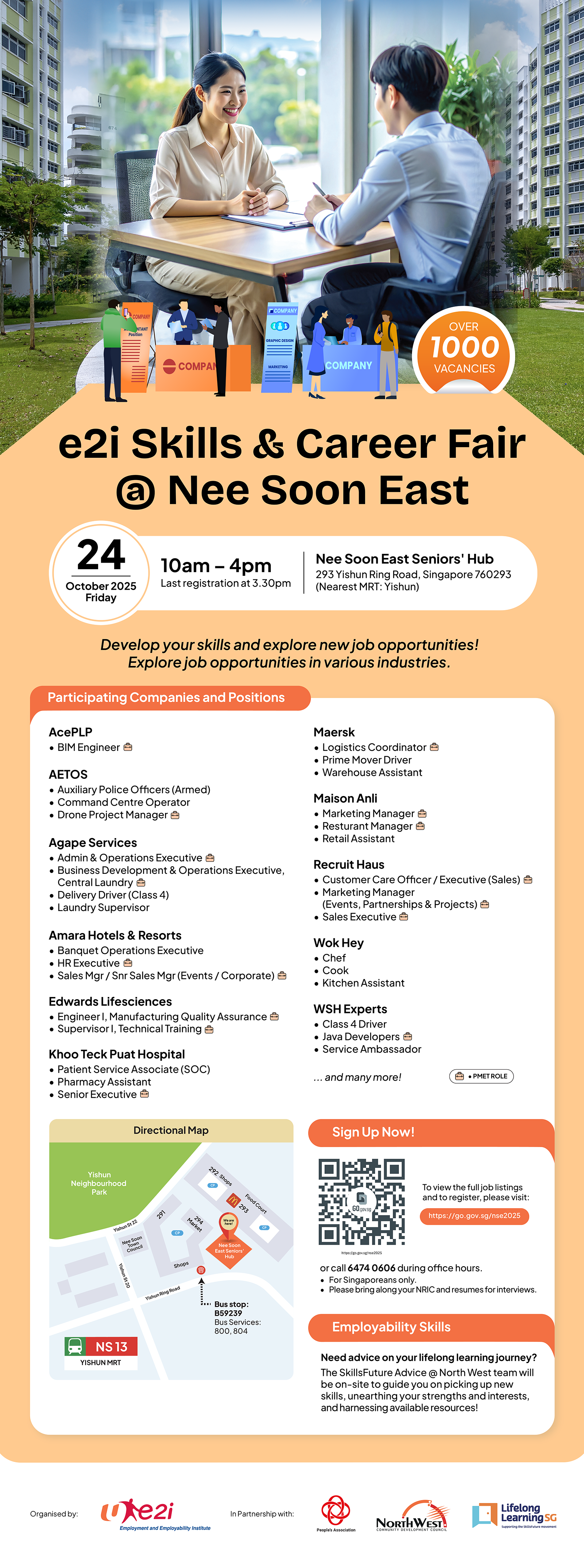 Drop by Nee Soon East Seniors' Hub to meet employers for face-to-face interview with hiring companies on 24 October 2025.
