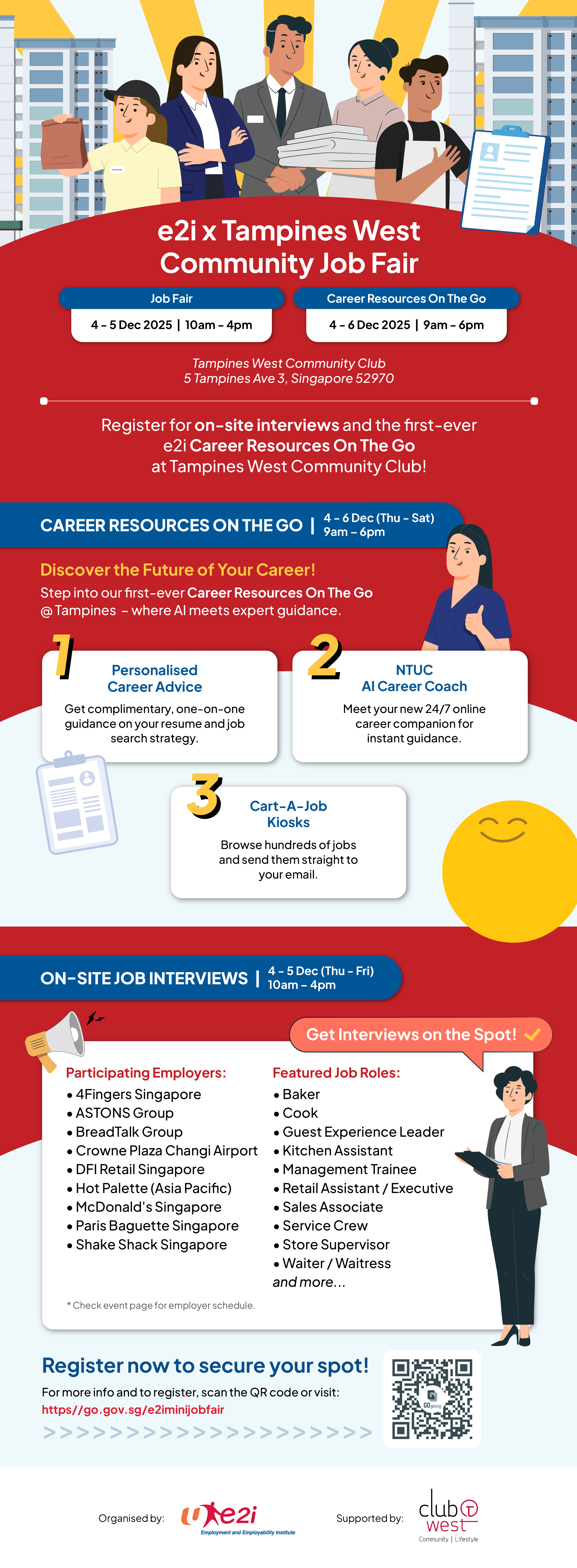 Register now for your on-site interviews with top employers, and experience the first-ever e2i Career Resources Exhibit in Tampines - exclusively at Tampines West Community Club!