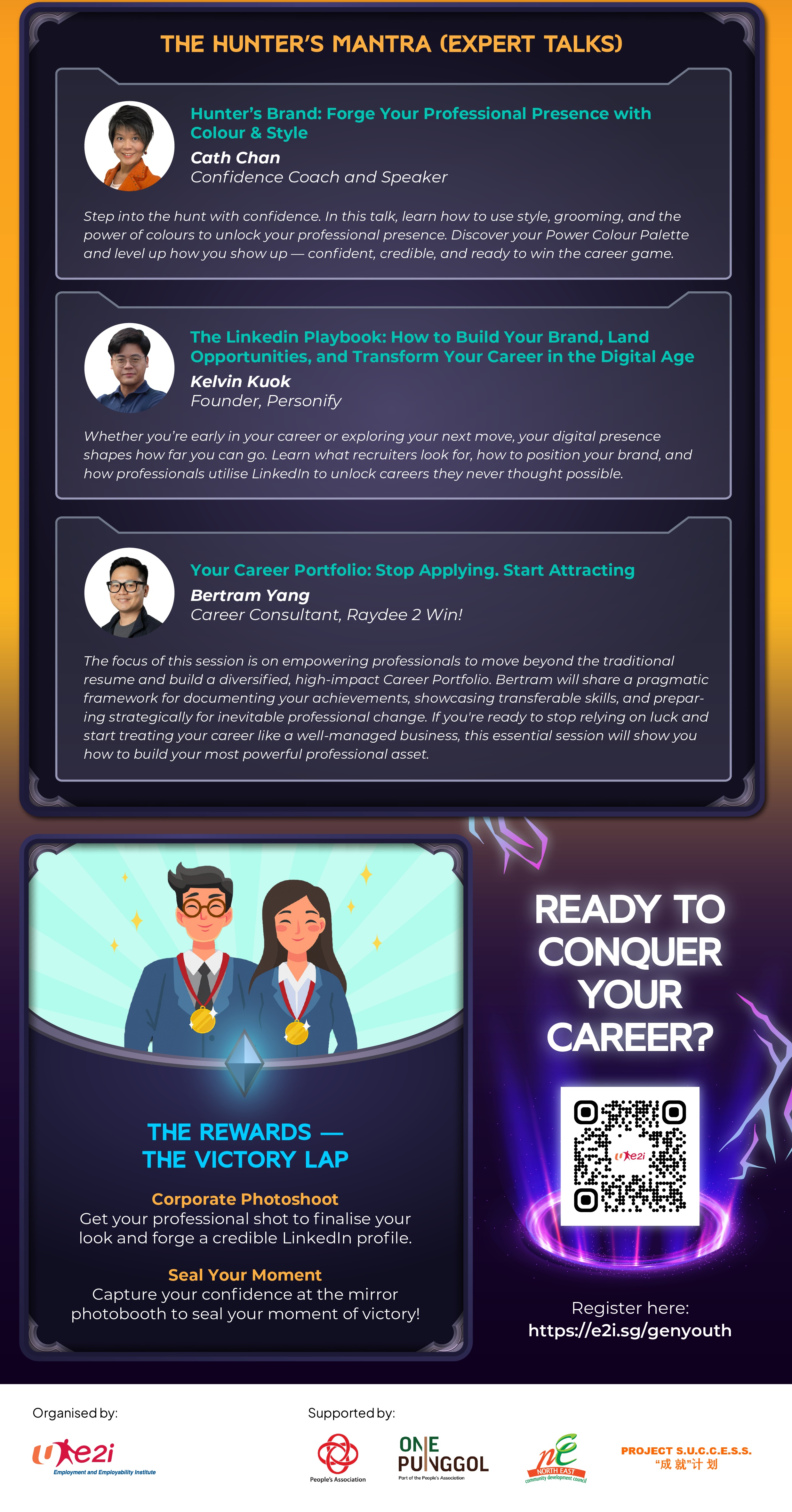 | 3.30pm to 4.30pm | Your Career Portfolio: Stop Applying, Start Attracting This session focuses on empowering you to move beyond the traditional resume and build a diversified, high-impact Career Portfolio. Bertram will share a pragmatic framework to document your achievements, showcase transferable skills, and strategically prepare for professional change. Stop relying on luck and start treating your career like a well-managed business. Learn how to build your most powerful professional asset. |