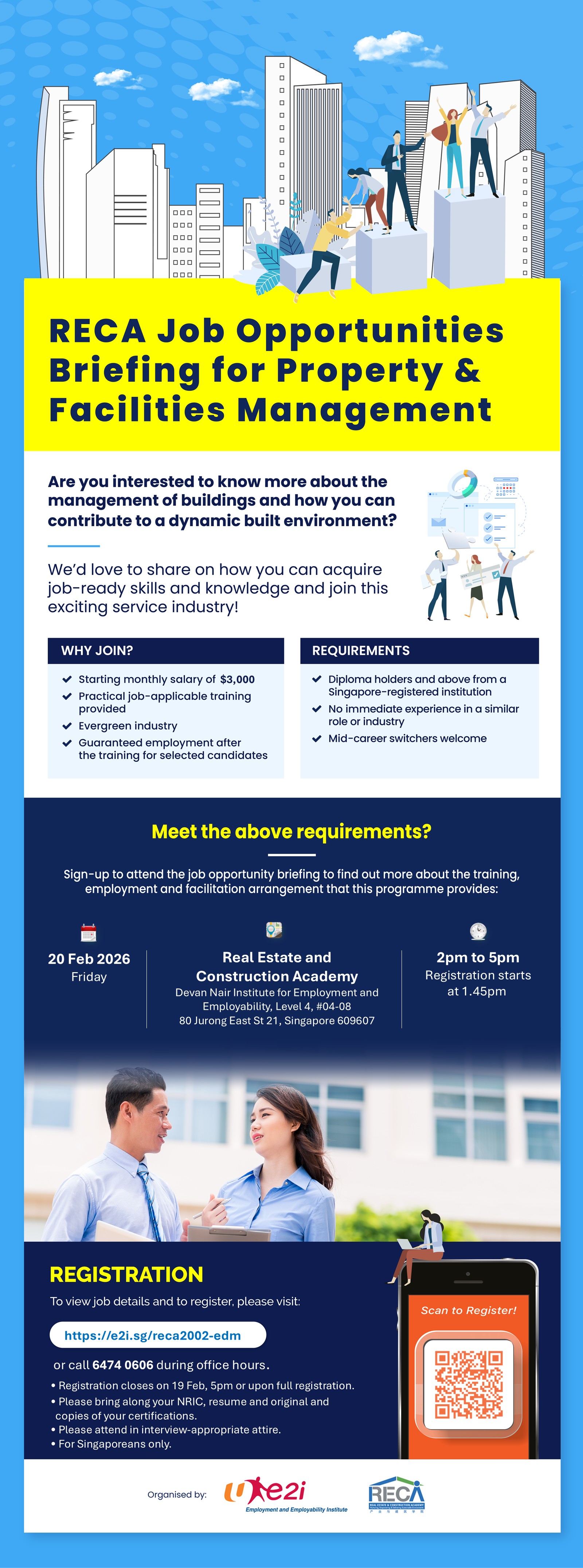 Note: Job Opportunities Briefing for Property & Facilities Management at RECA will start at 2 pm sharp. Please arrive by 1.45 pm. Please bring along the original & a copy of your NRIC, resume & relevant certificates for submission on the event day.