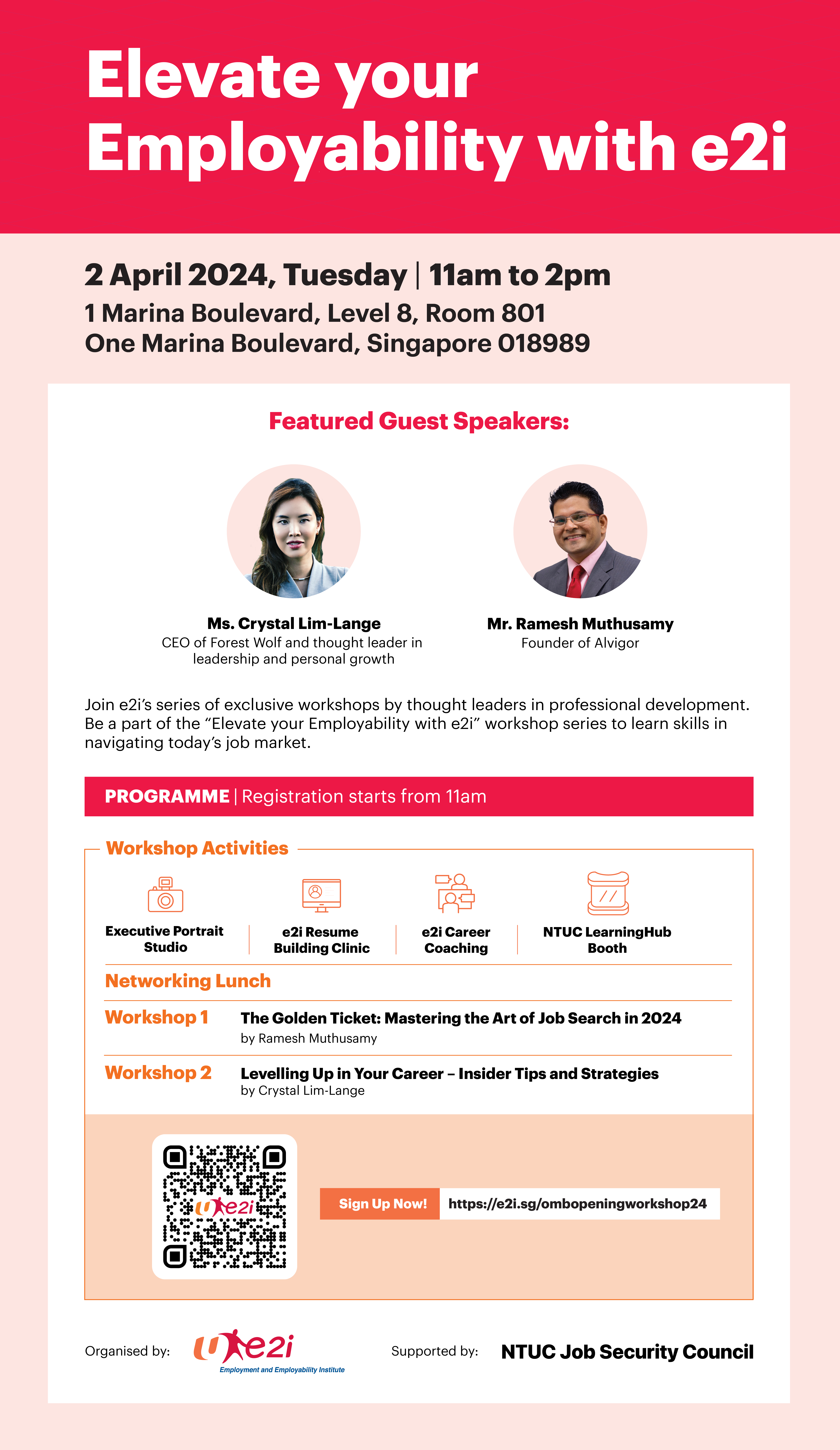Join e2i's series of exclusive workshops by thought leaders in professional development. Be part of the “Elevate your Employability with e2i” workshop series to learn skills in navigating today's job market.