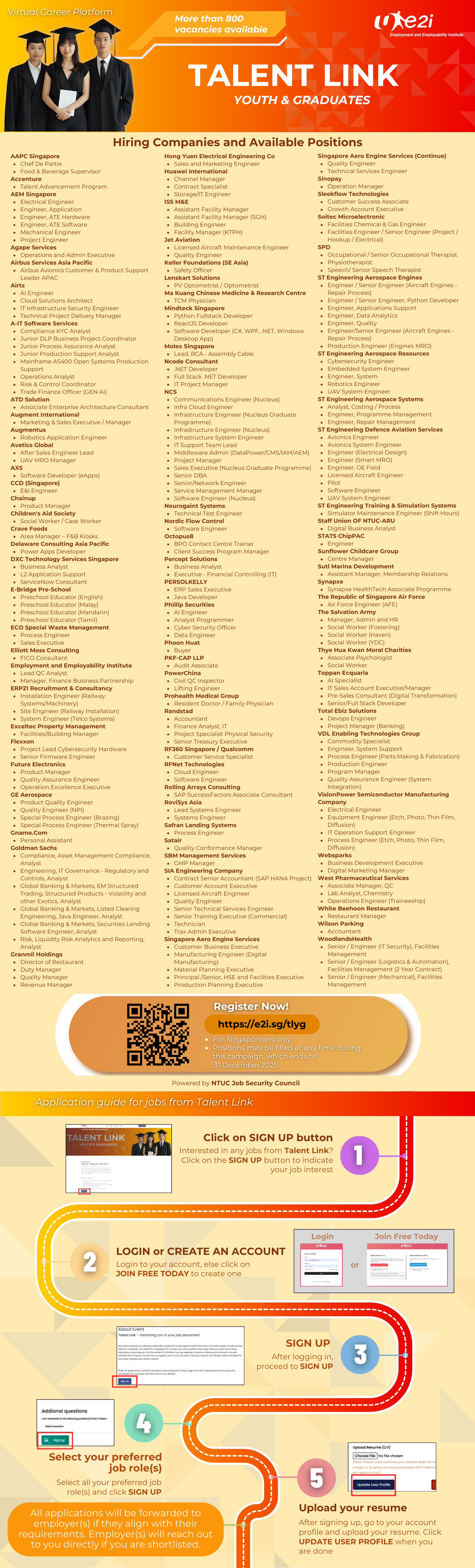 Talent Link connects you to exciting job opportunities in high-demand sectors β from entry-level roles to more experienced positions, across a wide range of industries. Whether you're just starting out or looking to grow your career, let NTUC's e2i match you with roles that align with your skills, interests, and goals.